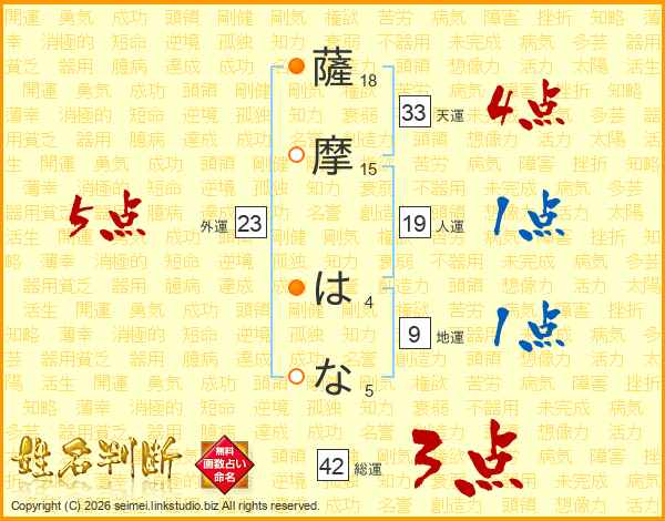 生活面を象徴する運勢です。外部から受ける影響力を表し、結婚運、家庭運や職場、環境への順応性を表します。総運から人運を引いた画数。姓や名が1文字の場合を除く。