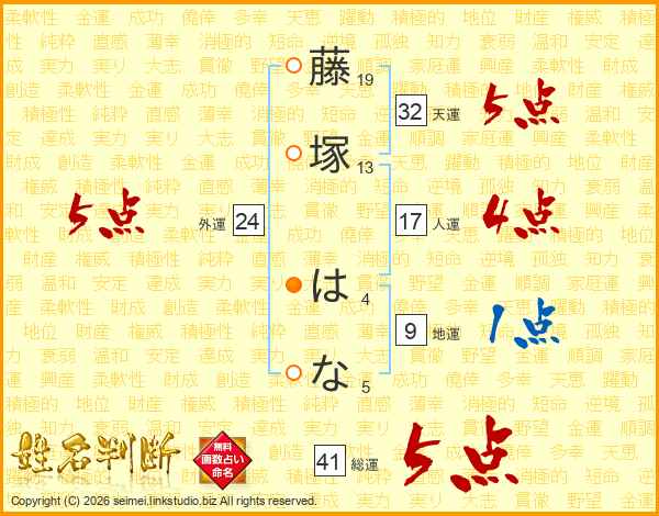生活面を象徴する運勢です。外部から受ける影響力を表し、結婚運、家庭運や職場、環境への順応性を表します。総運から人運を引いた画数。姓や名が1文字の場合を除く。