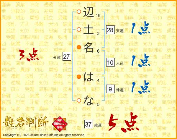 辺(19画)土(3画)名(6画) は(4画)な(5画)