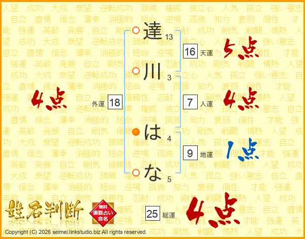 達川はなさんの総運は25画の4点!