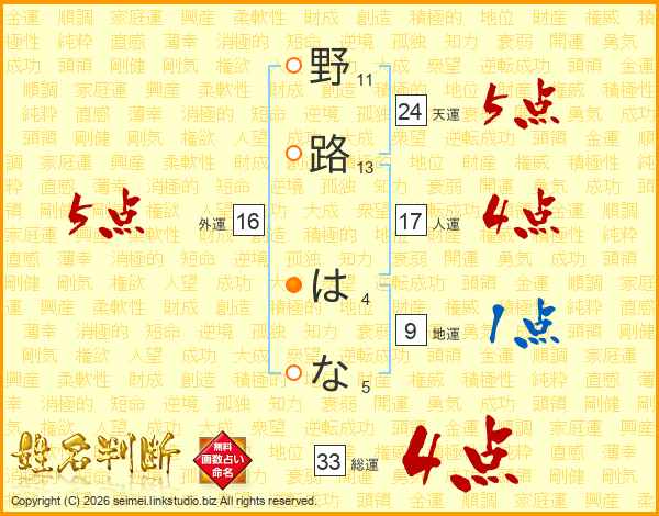 生活面を象徴する運勢です。外部から受ける影響力を表し、結婚運、家庭運や職場、環境への順応性を表します。総運から人運を引いた画数。姓や名が1文字の場合を除く。