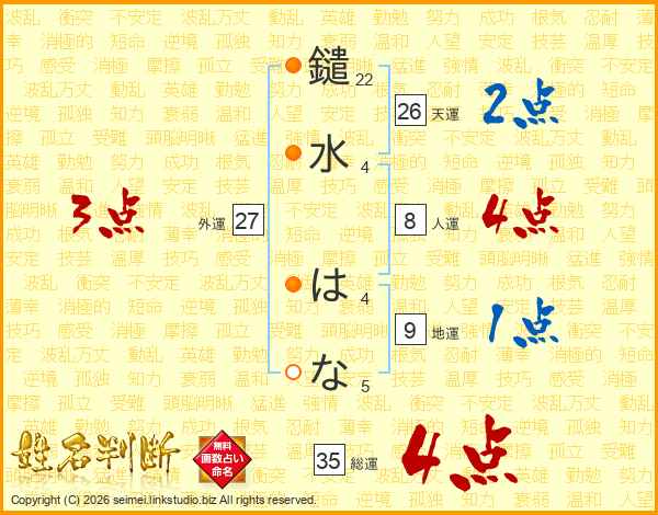 生活面を象徴する運勢です。外部から受ける影響力を表し、結婚運、家庭運や職場、環境への順応性を表します。総運から人運を引いた画数。姓や名が1文字の場合を除く。