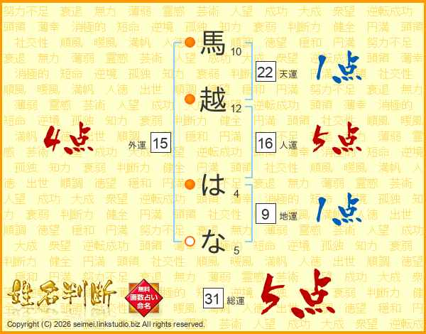 馬越はなさんの総運は31画の5点!