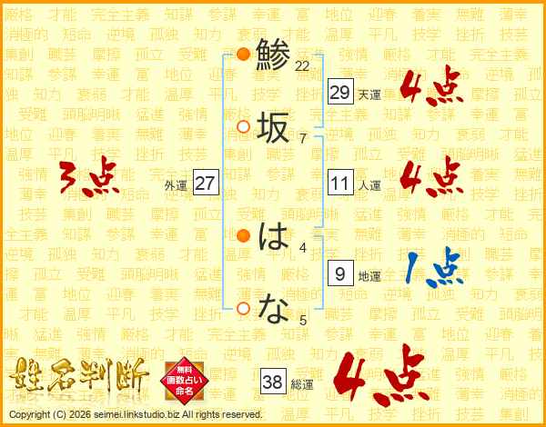 鯵坂はなさんの総運は38画の4点!