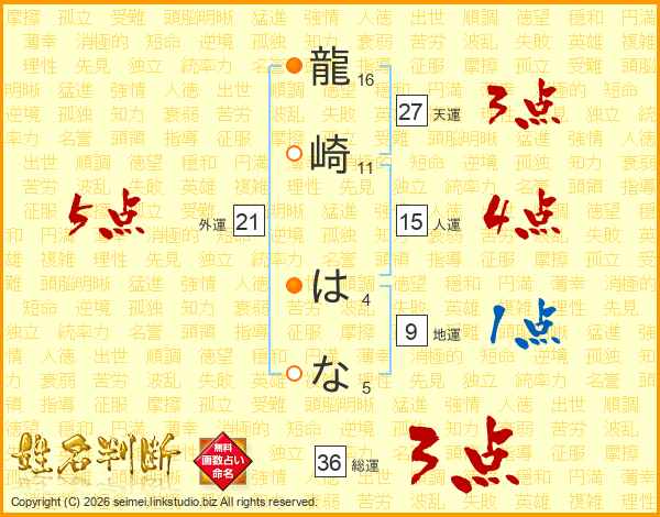 家系が持つ宿命的な運勢を表します。祖先から受け継いだ苗字ですので自分の力が及びません。家柄を象徴します。苗字の合計画数。