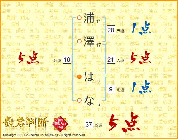 生活面を象徴する運勢です。外部から受ける影響力を表し、結婚運、家庭運や職場、環境への順応性を表します。総運から人運を引いた画数。姓や名が1文字の場合を除く。