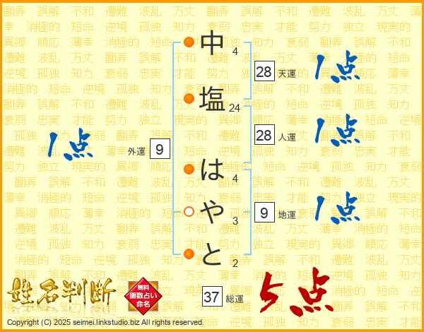 中(4画)塩(24画) は(4画)や(3画)と(2画)
