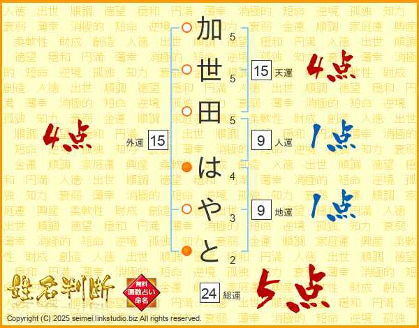 加(5画)世(5画)田(5画) は(4画)や(3画)と(2画)