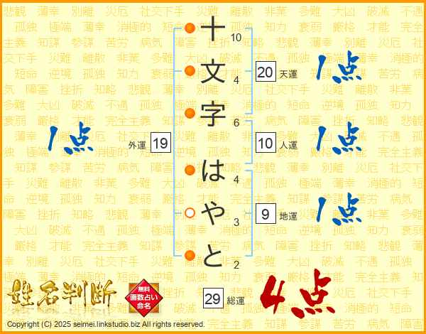 生活面を象徴する運勢です。外部から受ける影響力を表し、結婚運、家庭運や職場、環境への順応性を表します。総運から人運を引いた画数。姓や名が1文字の場合を除く。
