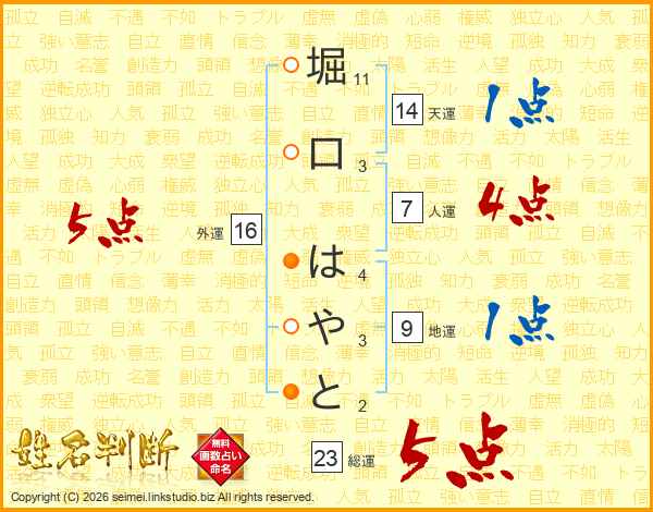 生活面を象徴する運勢です。外部から受ける影響力を表し、結婚運、家庭運や職場、環境への順応性を表します。総運から人運を引いた画数。姓や名が1文字の場合を除く。