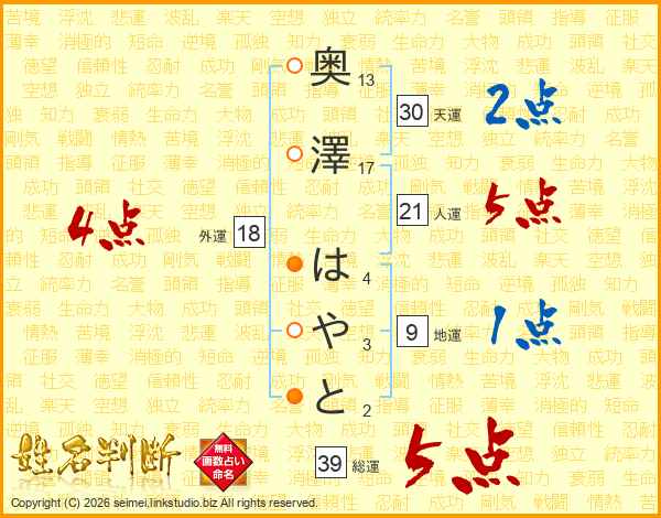 奥澤はやとさんの総運は39画の5点!
