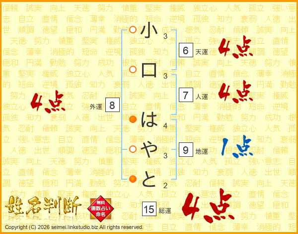 生活面を象徴する運勢です。外部から受ける影響力を表し、結婚運、家庭運や職場、環境への順応性を表します。総運から人運を引いた画数。姓や名が1文字の場合を除く。