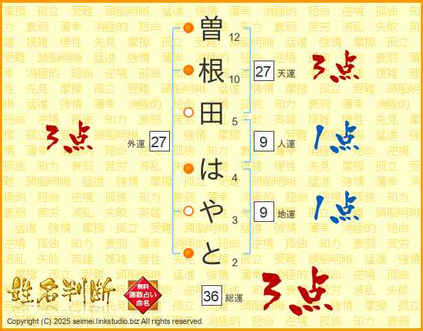 曽(12画)根(10画)田(5画) は(4画)や(3画)と(2画)