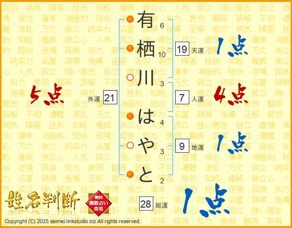 生活面を象徴する運勢です。外部から受ける影響力を表し、結婚運、家庭運や職場、環境への順応性を表します。総運から人運を引いた画数。姓や名が1文字の場合を除く。