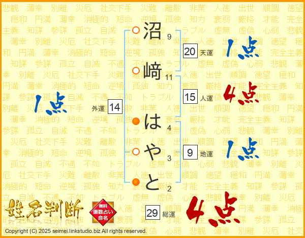 生活面を象徴する運勢です。外部から受ける影響力を表し、結婚運、家庭運や職場、環境への順応性を表します。総運から人運を引いた画数。姓や名が1文字の場合を除く。