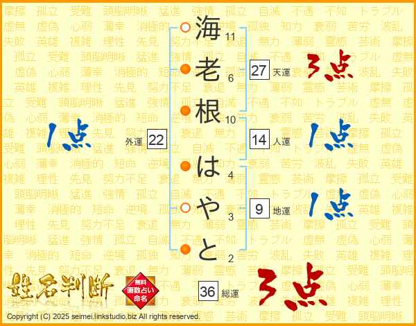 海(11画)老(6画)根(10画) は(4画)や(3画)と(2画)