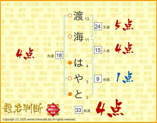 渡(13画)海(11画) は(4画)や(3画)と(2画)