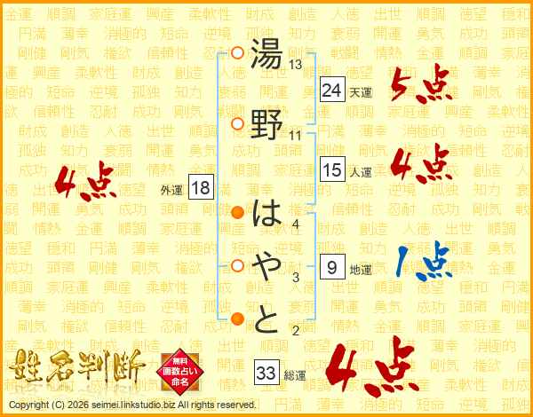 湯野はやとさんの総運は33画の4点!