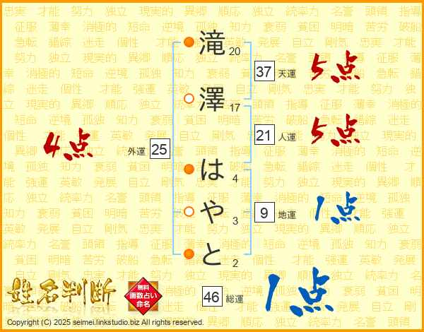 滝(20画)澤(17画) は(4画)や(3画)と(2画)