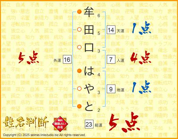 生活面を象徴する運勢です。外部から受ける影響力を表し、結婚運、家庭運や職場、環境への順応性を表します。総運から人運を引いた画数。姓や名が1文字の場合を除く。