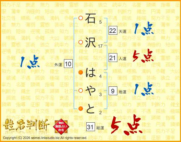 石沢はやとさんの総運は31画の5点!