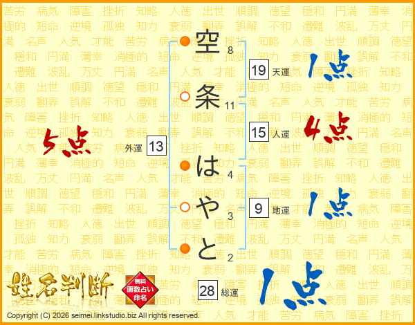 あなたの人生を表す1番重要な運勢です。生涯を通じて影響する総合運となり、主に50歳以降の晩年期に影響を及ぼします。苗字と名前の合計画数。