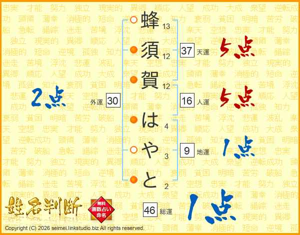 蜂(13画)須(12画)賀(12画) は(4画)や(3画)と(2画)