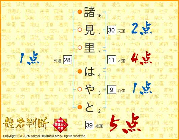 諸見里はやとさんの総運は39画の5点!