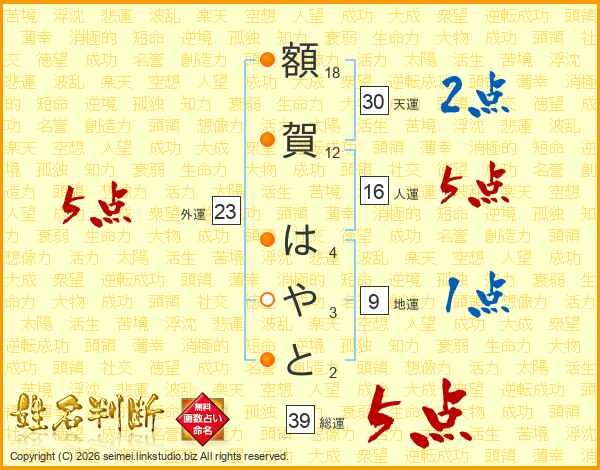 額賀はやとさんの総運は39画の5点!