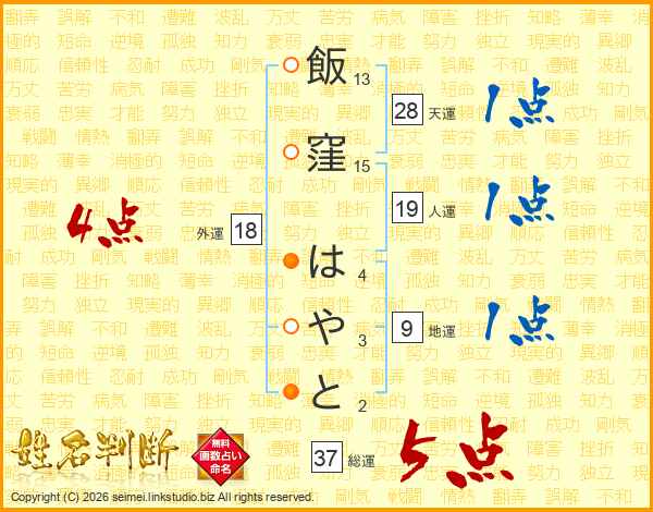 飯(13画)窪(15画) は(4画)や(3画)と(2画)
