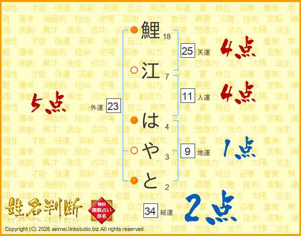 鯉江はやとさんの天運は25画の4点!