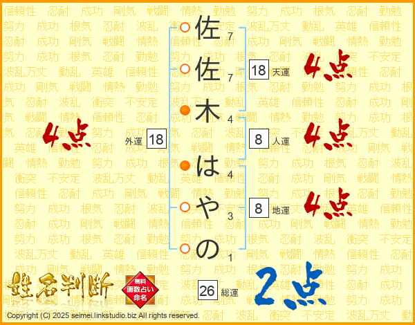 佐(7画)佐(7画)木(4画) は(4画)や(3画)の(1画)