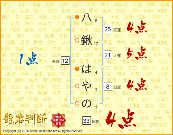 八鍬はやのさんの総運は33画の4点!