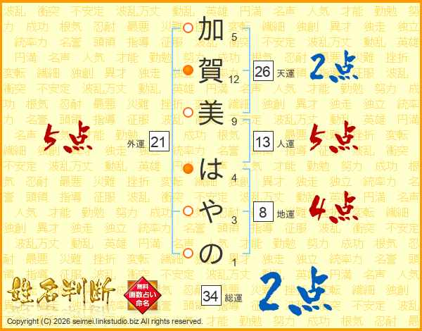 加(5画)賀(12画)美(9画) は(4画)や(3画)の(1画)