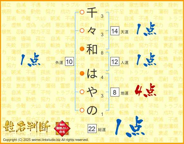 生活面を象徴する運勢です。外部から受ける影響力を表し、結婚運、家庭運や職場、環境への順応性を表します。総運から人運を引いた画数。姓や名が1文字の場合を除く。