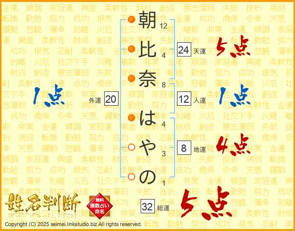 朝(12画)比(4画)奈(8画) は(4画)や(3画)の(1画)