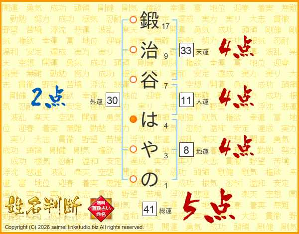 生活面を象徴する運勢です。外部から受ける影響力を表し、結婚運、家庭運や職場、環境への順応性を表します。総運から人運を引いた画数。姓や名が1文字の場合を除く。