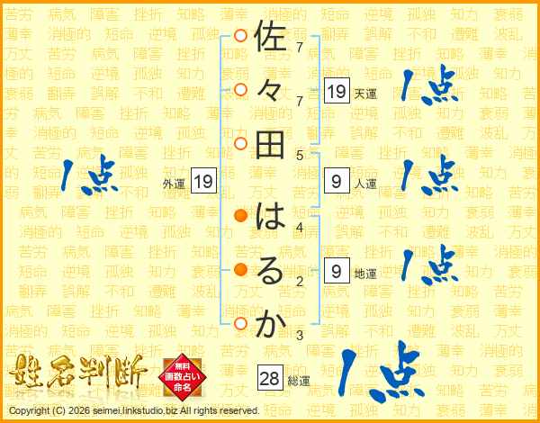 佐(7画)々(7画)田(5画) は(4画)る(2画)か(3画)