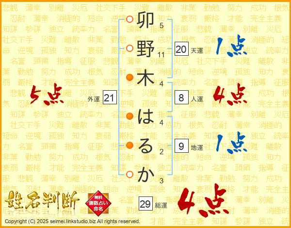 卯(5画)野(11画)木(4画) は(4画)る(2画)か(3画)