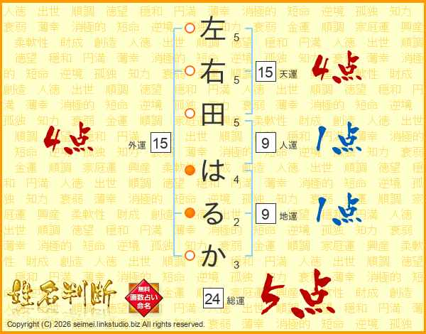 左右田はるかさんの外運は15画の4点!