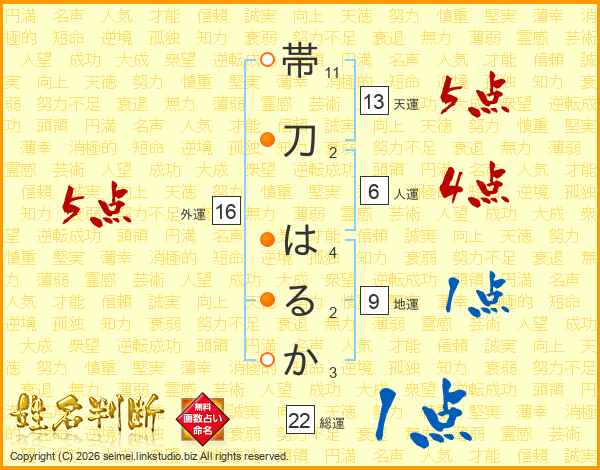帯刀はるかさんの総運は22画の1点!