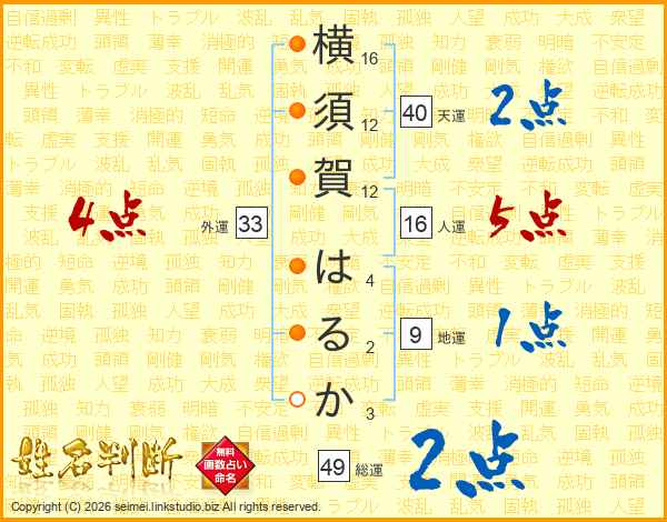 横(16画)須(12画)賀(12画) は(4画)る(2画)か(3画)