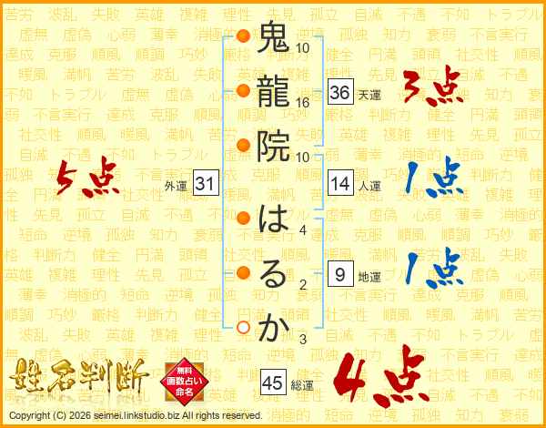 鬼龍院はるかさんの総運は45画の4点!