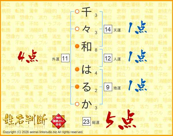 千(3画)々(3画)和(8画) は(4画)る(2画)か(3画)