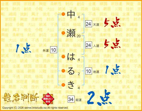 生活面を象徴する運勢です。外部から受ける影響力を表し、結婚運、家庭運や職場、環境への順応性を表します。総運から人運を引いた画数。姓や名が1文字の場合を除く。