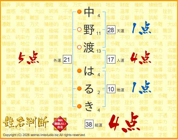 中(4画)野(11画)渡(13画) は(4画)る(2画)き(4画)