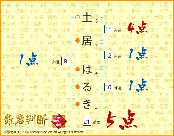 土(3画)居(8画) は(4画)る(2画)き(4画)