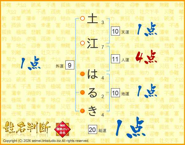 土(3画)江(7画) は(4画)る(2画)き(4画)