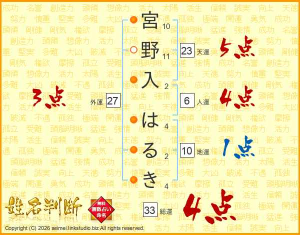 宮(10画)野(11画)入(2画) は(4画)る(2画)き(4画)