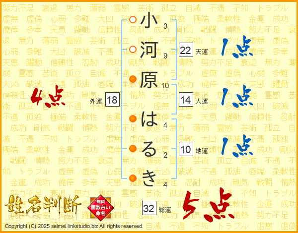 生活面を象徴する運勢です。外部から受ける影響力を表し、結婚運、家庭運や職場、環境への順応性を表します。総運から人運を引いた画数。姓や名が1文字の場合を除く。